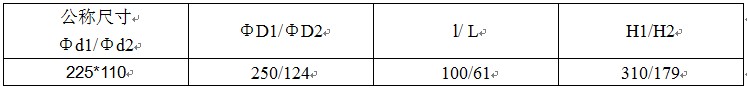 其中“ΦD1”表示管件主管口公称外径,“Φd1”表示管件主管口公称内径,“ΦD2”表示管件支管口公称外径,“Φd2”表示管件支管口公称内径,“L”管件主管口承插长度,“l”表示管件支管口承插长度,“H1”管件长度,“H2”表示管件中心距,1.0MPa=10公斤