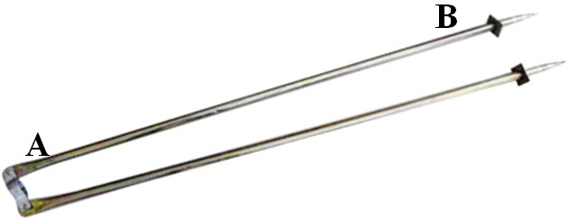 支架连接说明: 将喷杆套入A端,B端插入地面即可正常使用。