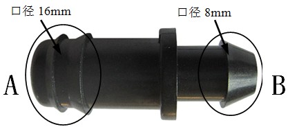 4. 将管件的双倒刺A端插入修剪好的滴灌管(或PE管)内,保证双倒刺全部没入滴灌管(或PE管)内。